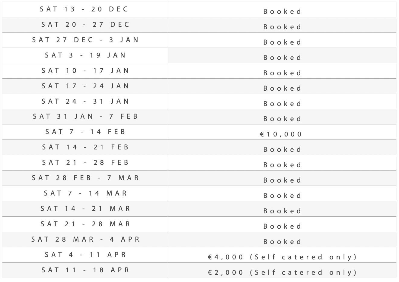 Prices are for sole occupancy for up to 8 people on a fully catered basis. Supplement applied for additional guests – please get in touch for a tailored quote for your group!